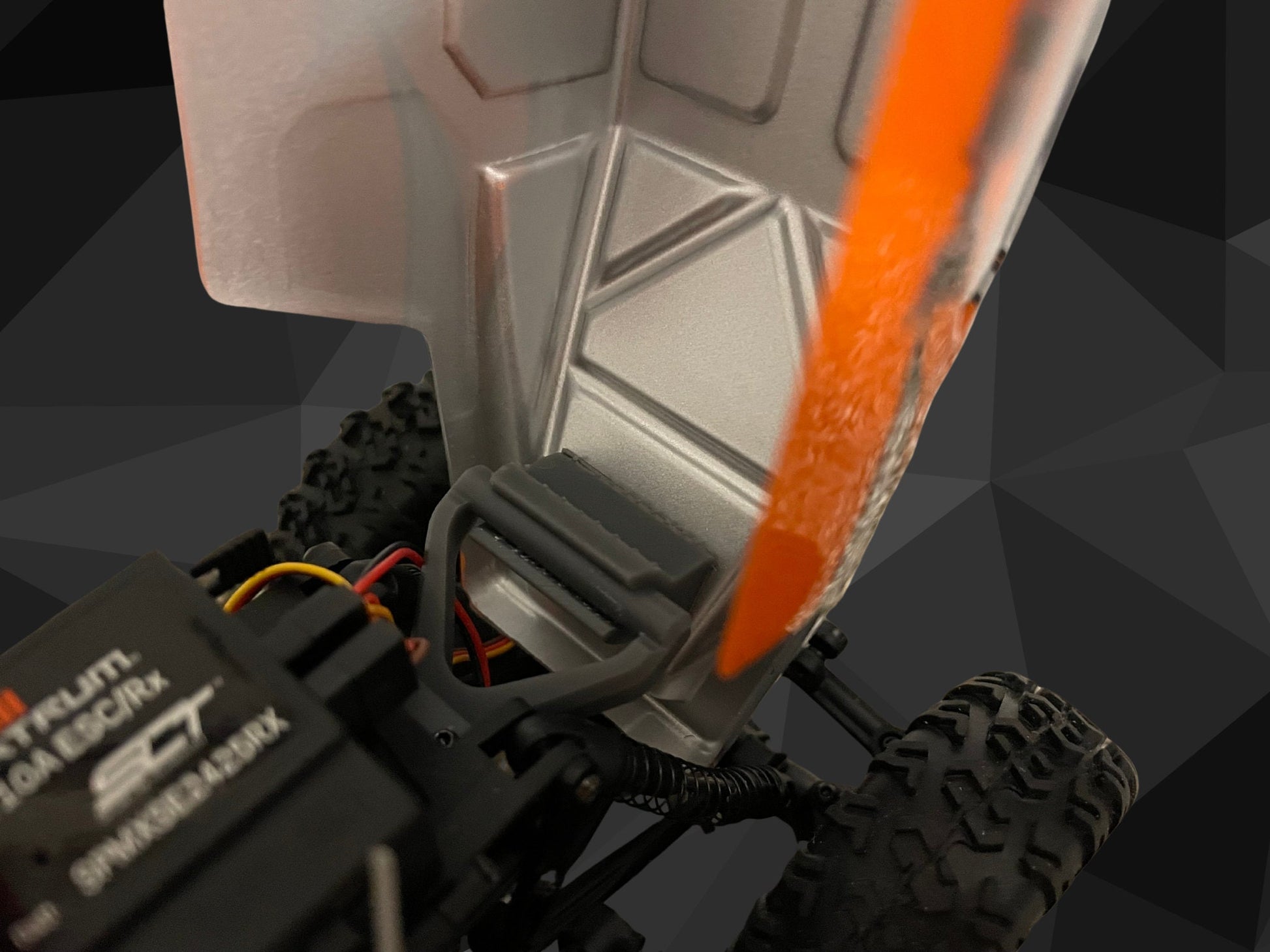Do you want to never use body clips or Velcro on your AX24 again? This clipless latch system bolts directly onto your AX24 with ZERO modification to the truck (100% reversible). It snaps into the lower portion shown in the front and allows for a secure hold on the body without using velcro. In the rear is a simple rotating mechanism that allows you to easily slide off the entire body for easy access when needed or just prop it up! Simply hold the front wheels down and pull up on the front fenders to pop the clip free. Under normal use this design can take tumbles and rolls and only opens when you want it to. When running trails or crawling rocks the latch stays secure and holds the body in place. Uses existing hardware so there is nothing additional needed. I performed FEA (simulation) on this design so I expect it to last a long time barring any abuse. This part is resin printed in Formlabs Tough 2000 so it is closer in comparison to ABS than your typical 3D printed plastic.