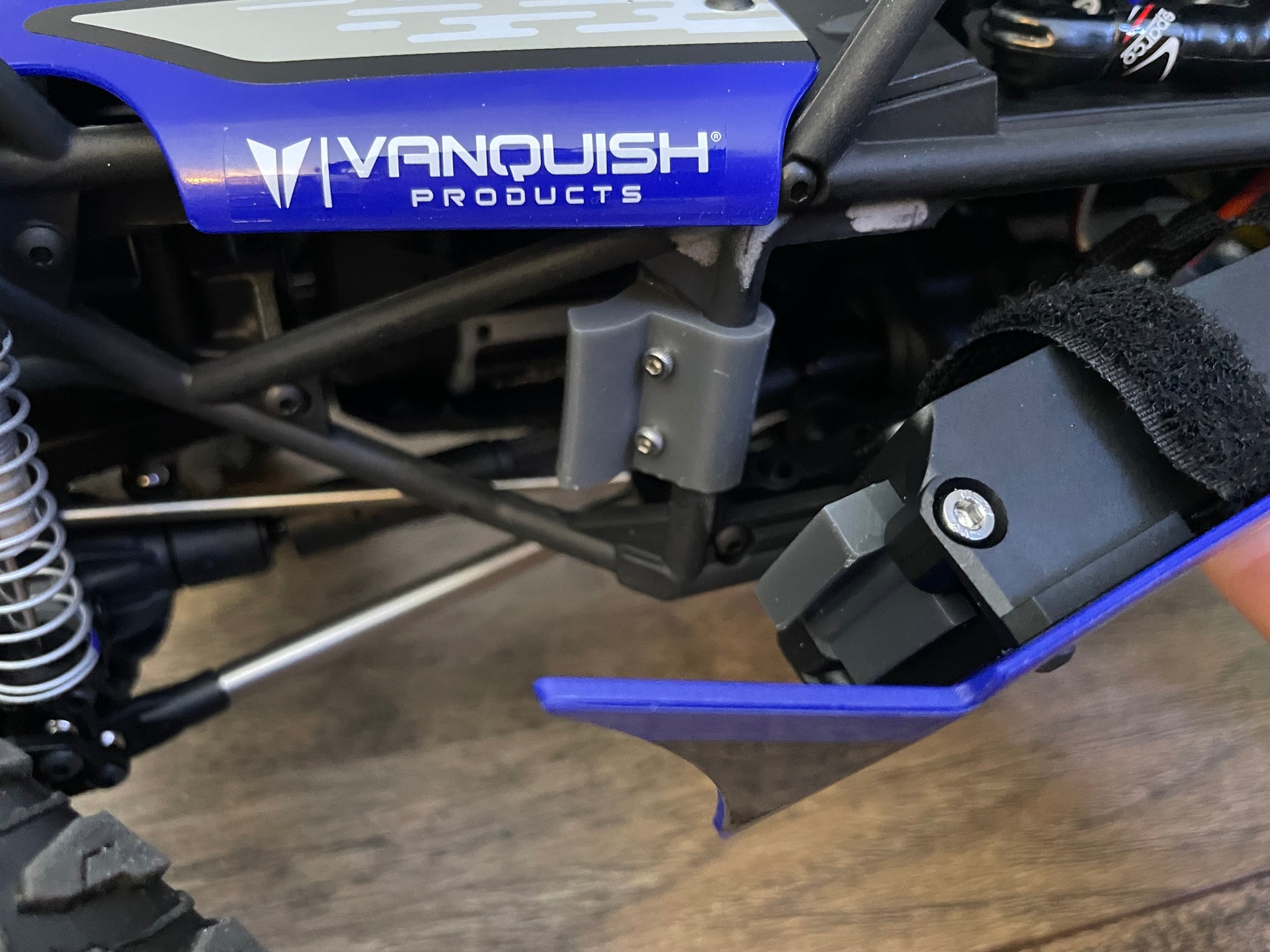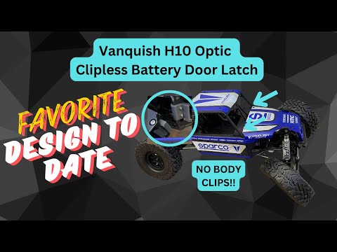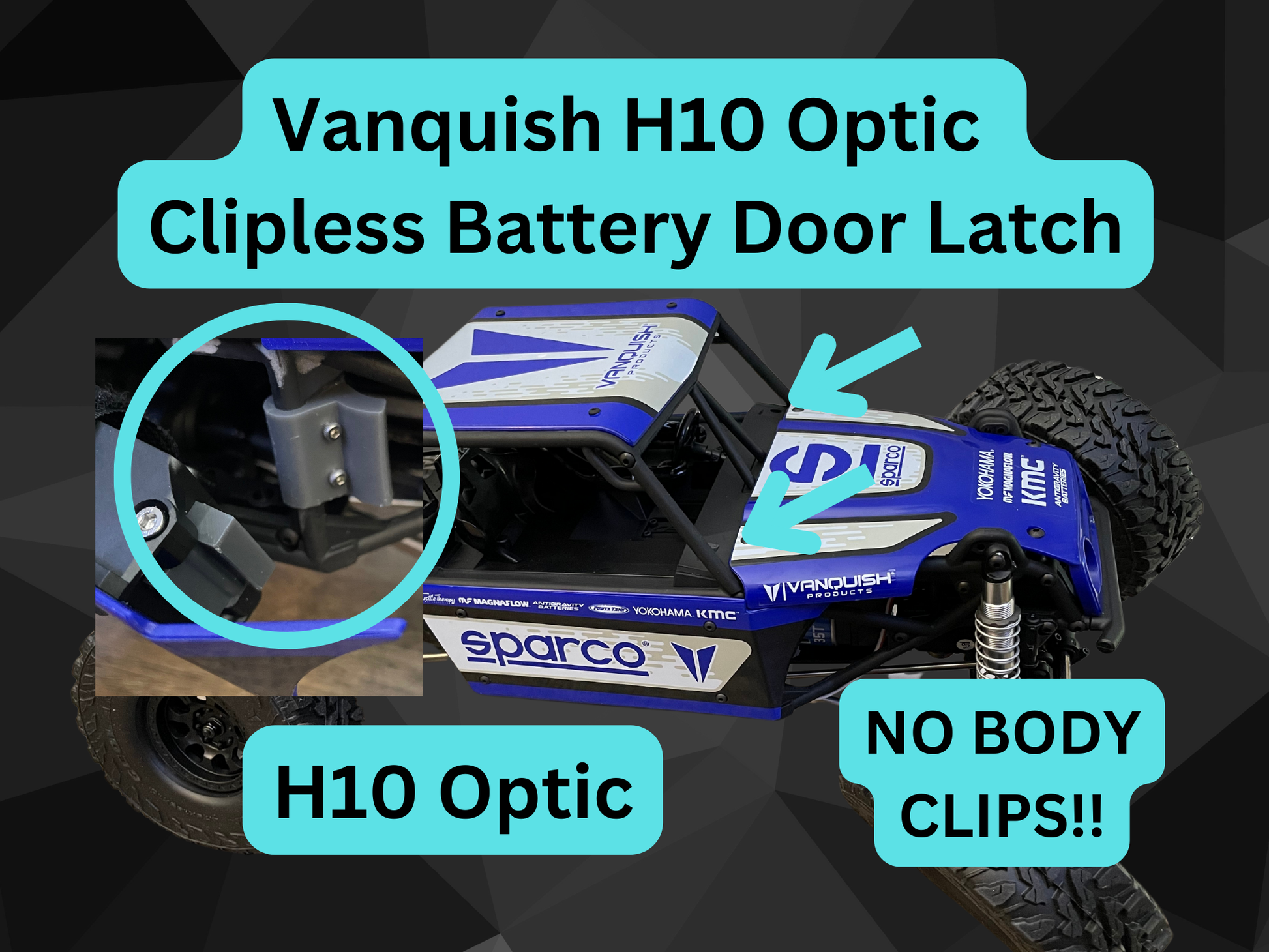 Changing your battery on your Vanquish H10 Optic has never been easier with this clipless battery door latch that bolts directly to the truck with ZERO permanent modification to the truck (100% reversible). Comes with BOTH driver and passenger side pieces (6 total + included hardware). It turns and locks into the part added onto the battery door and allows for a secure hold on the body without using body clips. Simply pull towards the outside of the truck on the latch and the battery door releases allowing you to open it up. To close simply push the battery door all the way shut and then push the latch all the way in till it stops. When running trails or crawling rocks the latch stays secure and holds the body in place. Stainless steel hardware so you don't have to worry about driving this through water. This part is resin printed in Formlabs Tough 2000 so it is closer in comparison to ABS than your typical 3D printed plastic.
