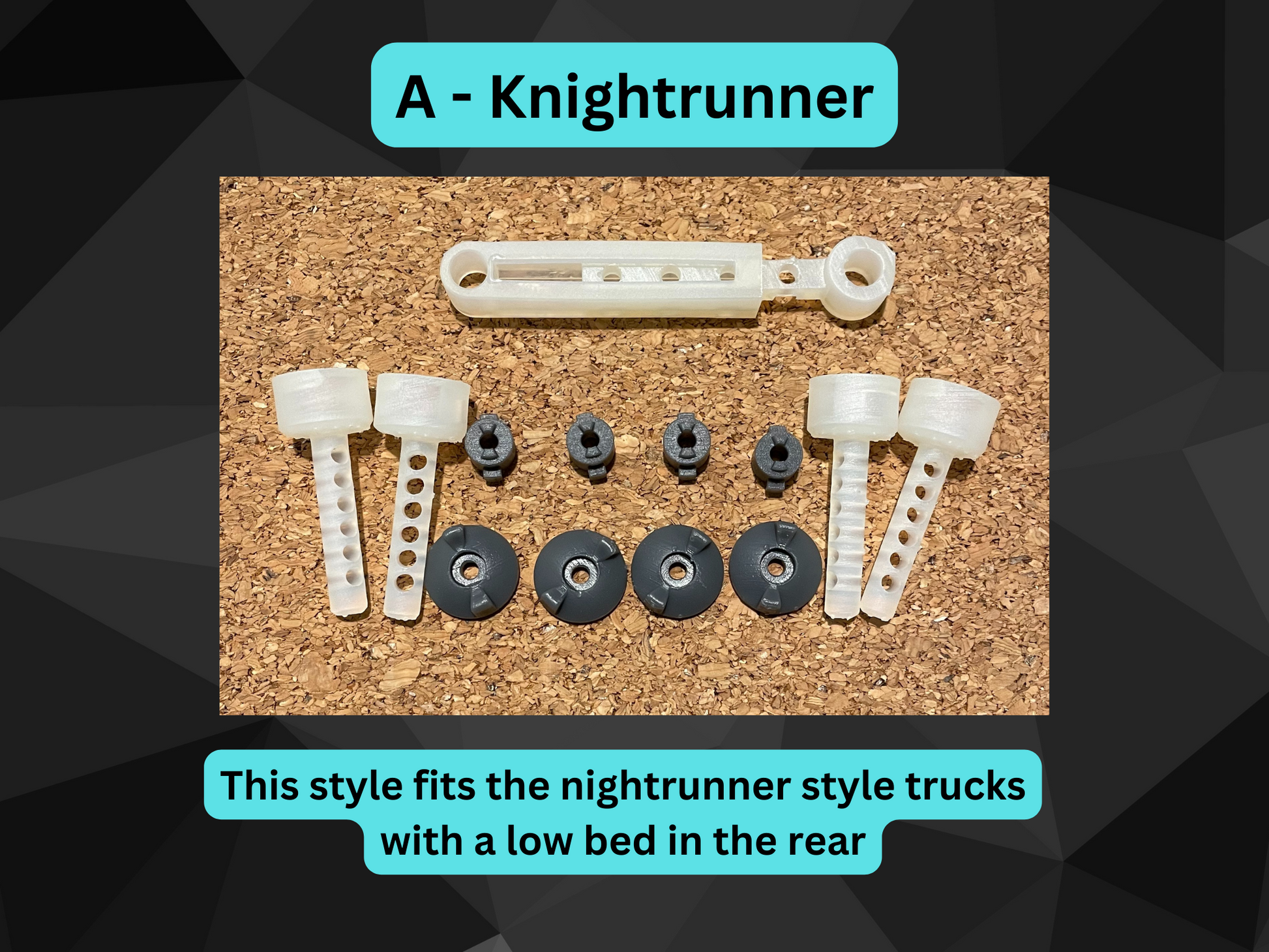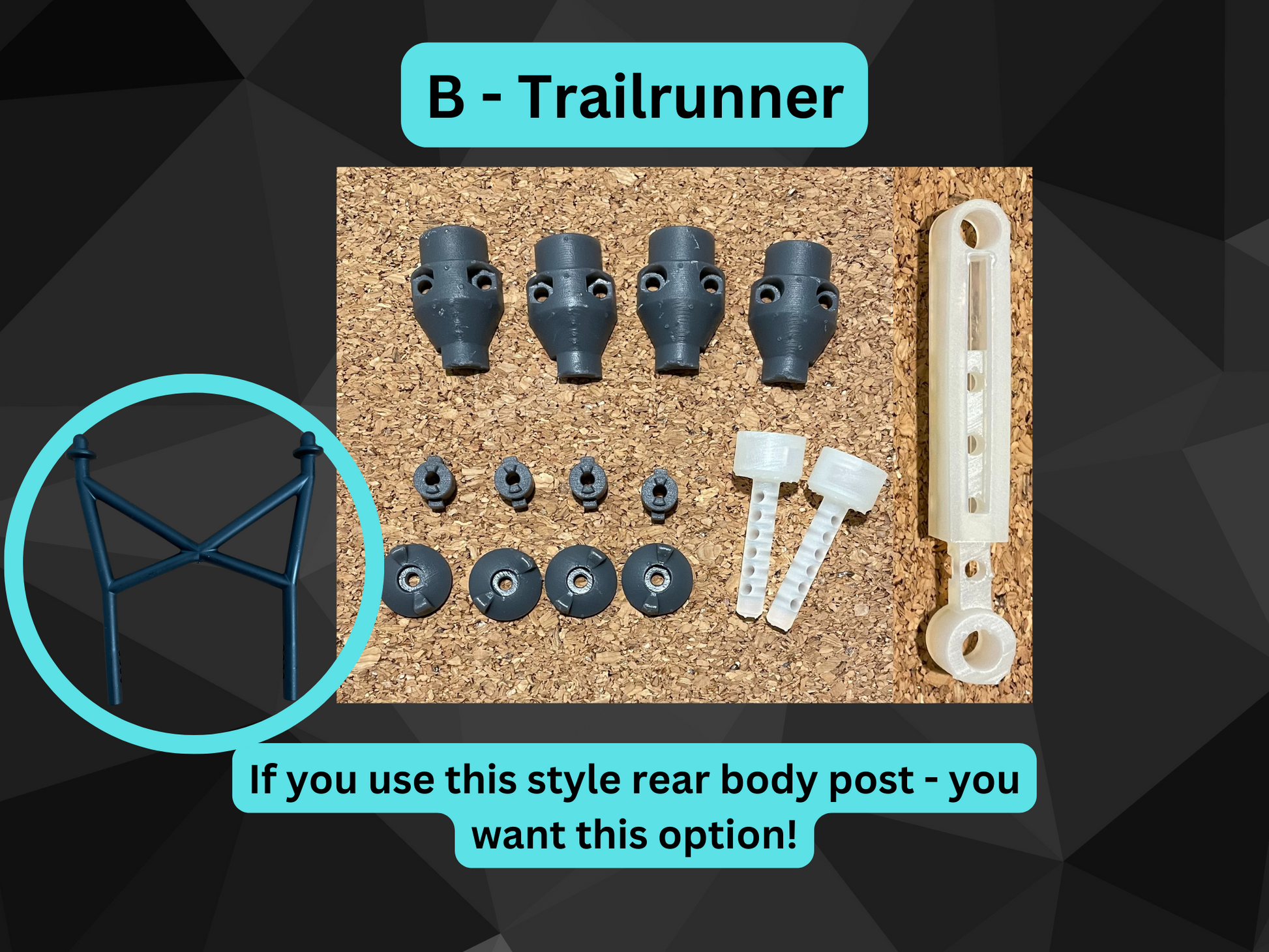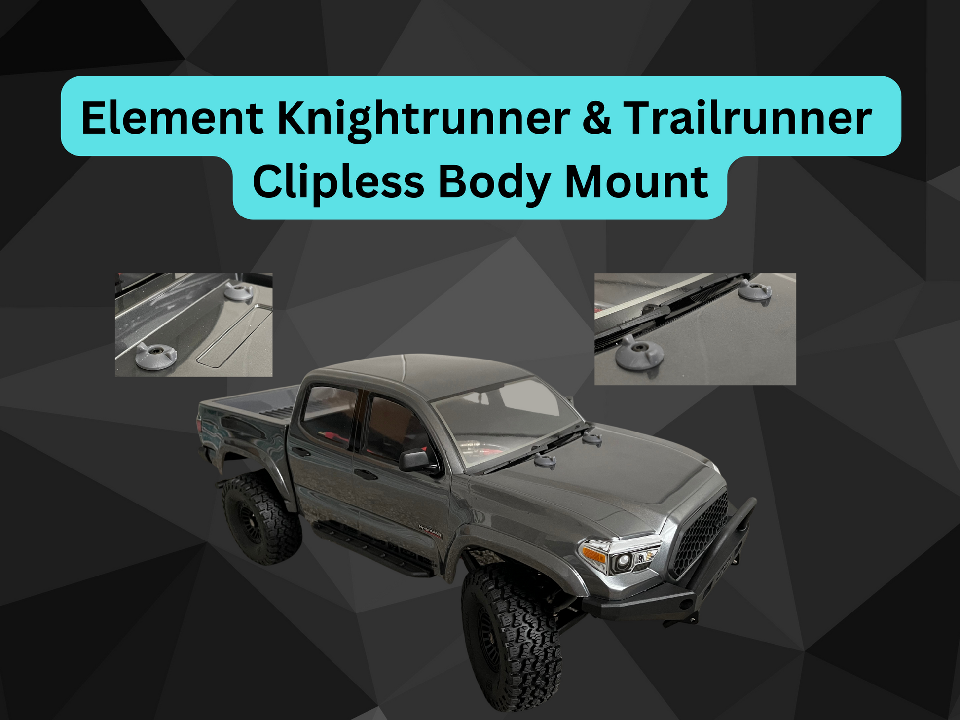 Do you want to never use body clips again? This clipless body mount bolts directly onto your Element (Knightrunner/Trailwalker or Trailrunner) RC with ZERO modification to the truck (100% reversible). It locks into the lower portion included and allows for a secure hold on the body without using body clips. Be sure to select the right option (A or B) for short or tall body posts in the rear of your truck (see the listing photos for the difference). Fitment will likely work with aftermarket bodies as well due to the adjustability of the body posts. The front is identical, but the rear design is different between the two trucks. The Knightrunner version also fits the Trailwalker truck body as well. Simply twist the lock (counter-clockwise) and the body releases allowing you to open it up. When running trails or crawling rocks the latch stays secure and holds the body in place. This part is resin printed in Formlabs Tough 2000 and Formlabs Durable so these parts are meant to last. The front brace is now included with the kit! Please note, I rate this system as a light to medium duty system since with excessive force and repeated crashing that can result in a broken part.