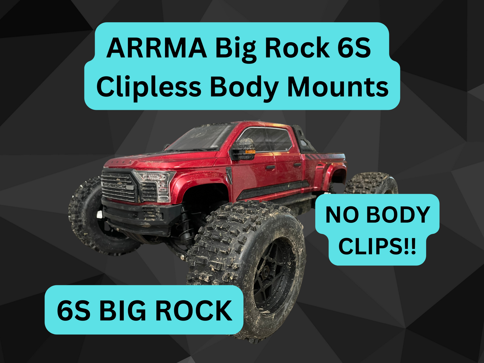 Introducing a quick and easy clipless body mounting solution for your Arrma Big Rock 6S! Simply twist the top knob 90 degrees counter-clockwise to unlock or 90 degrees clockwise to lock! Extremely simple to install and extremely durable due to being printed in Formlabs Durable resin. Make your Big Rock completely Clipless as it should have been from the factory! This solution means you'll never lose a body clip ever again since these parts are always bolted to the truck. Never forget to bring them with you and whenever you need to access the underside you can do so in seconds without any pain! No permanent modifications required! This install is 100% reversible or transferrable if you get a new body! Additionally, this resin accepts any of your standard hardware store paints so you can paint match it to your body! These parts are designed to last an extremely long time and as always just reach out if you have any questions or needs!