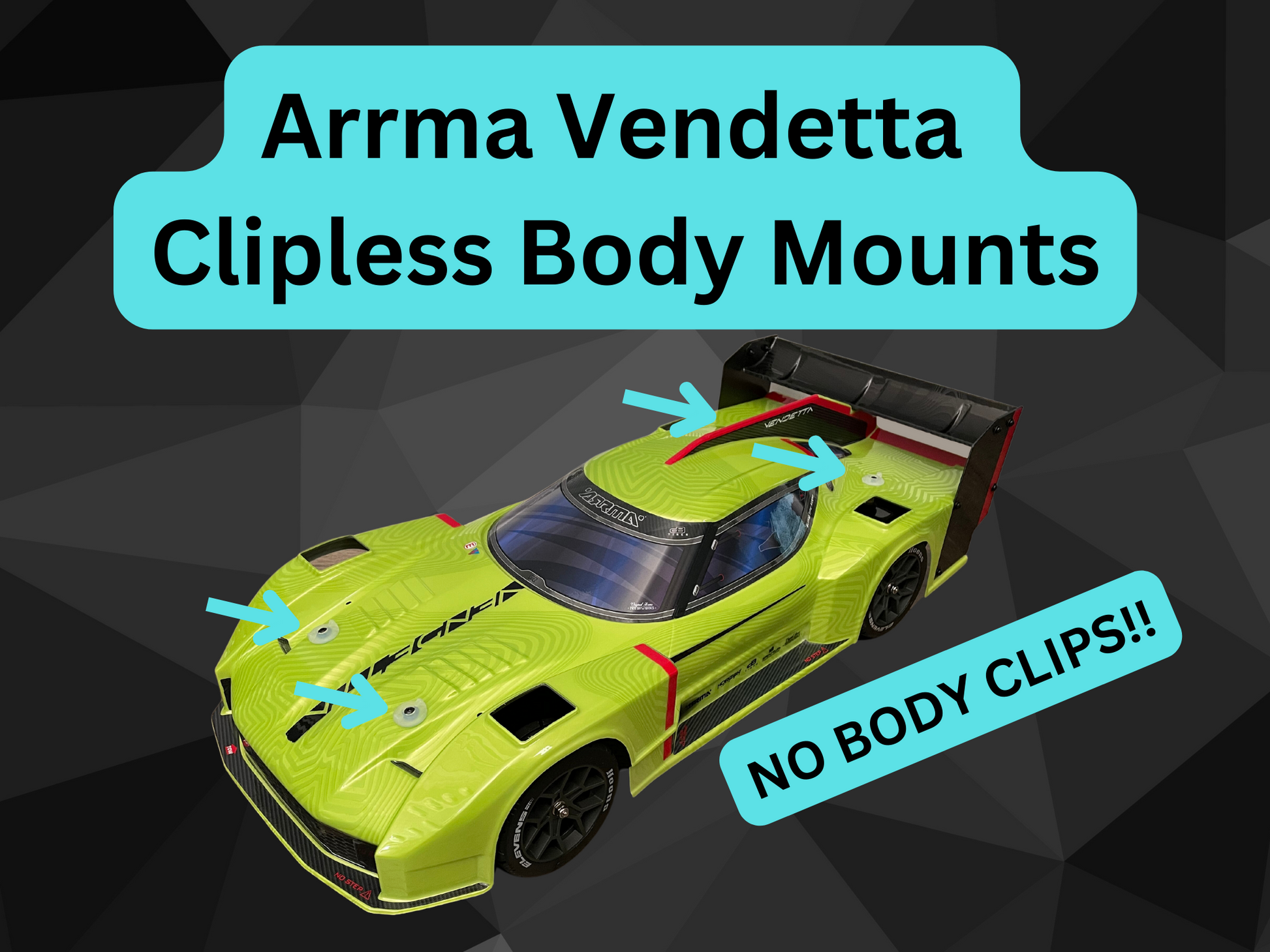 Introducing a quick and easy clipless body mounting solution for your Arrma Vendetta! Simply twist the top knob 90 degrees counter-clockwise to unlock or 90 degrees clockwise to lock! Extremely simple to install and extremely durable due to being printed in Formlabs Durable resin. This solution means you'll never lose a body clip ever again since these parts are always bolted to the truck. Never forget to bring them with you and whenever you need to access the underside you can do so in seconds without any pain! No permanent modifications required! This install is 100% reversible or transferrable if you get a new body! Additionally, this resin accepts any of your standard hardware store paints so you can paint match it to your body! These parts are designed to last an extremely long time and as always just reach out if you have any questions or needs!