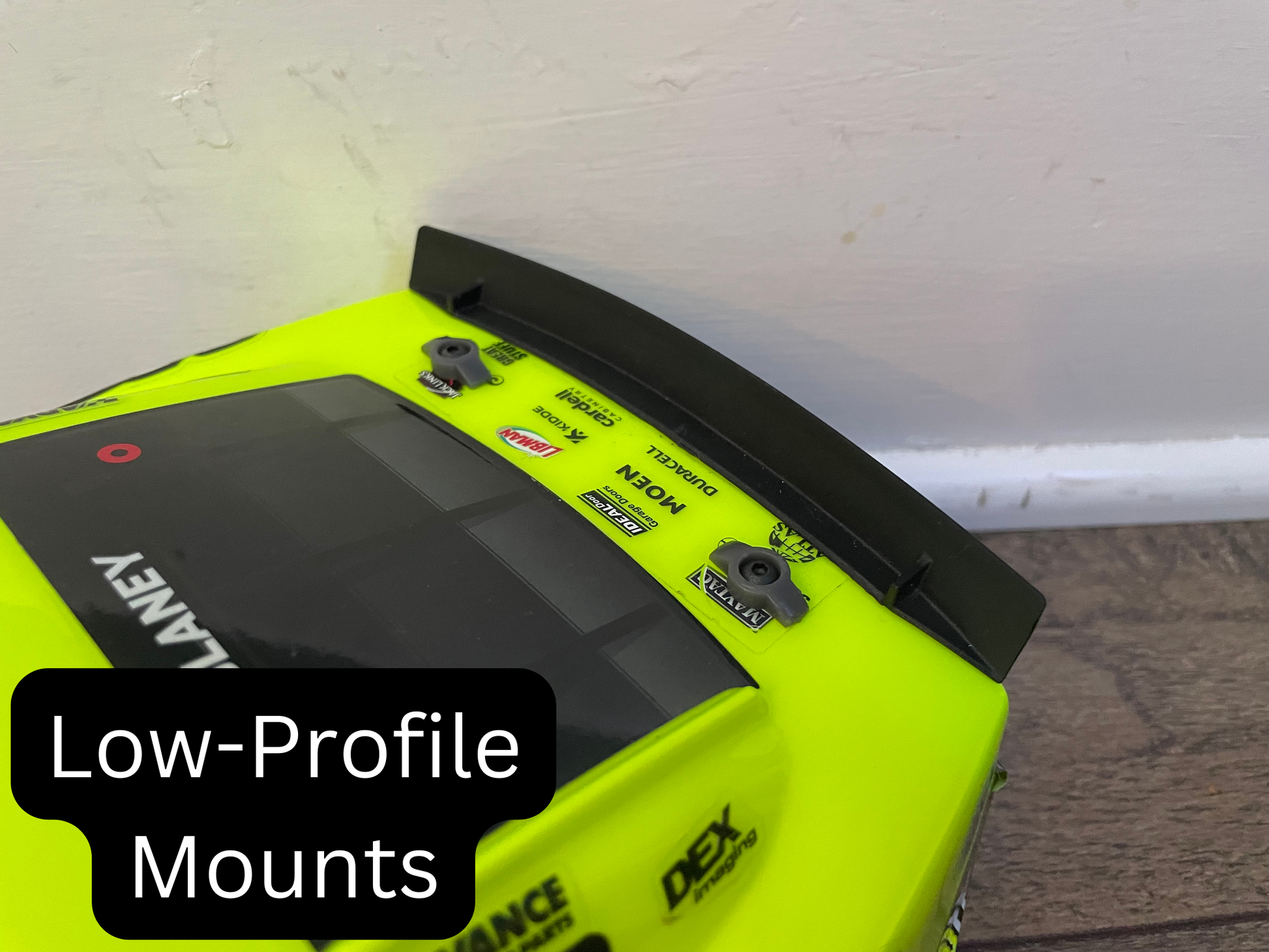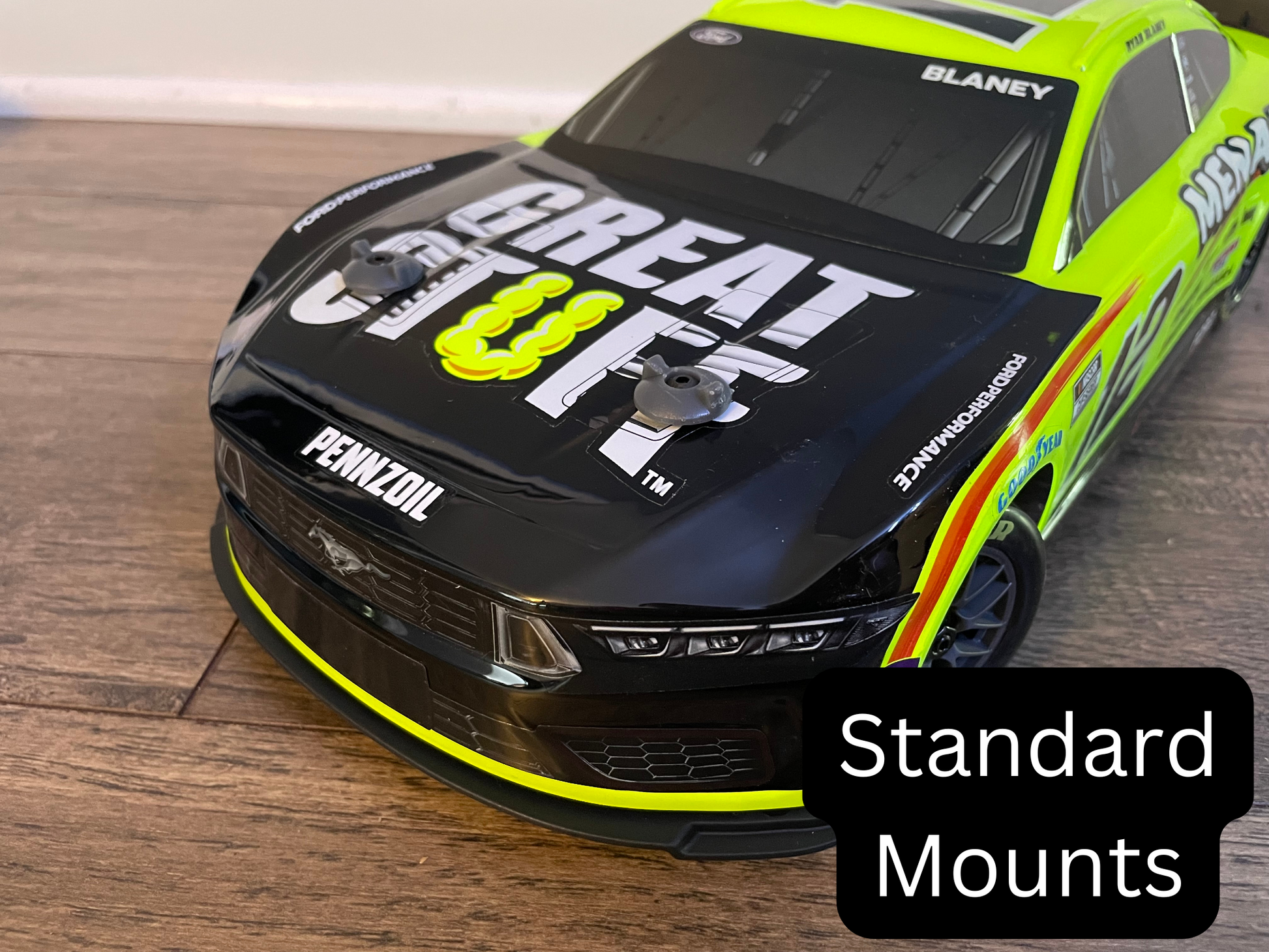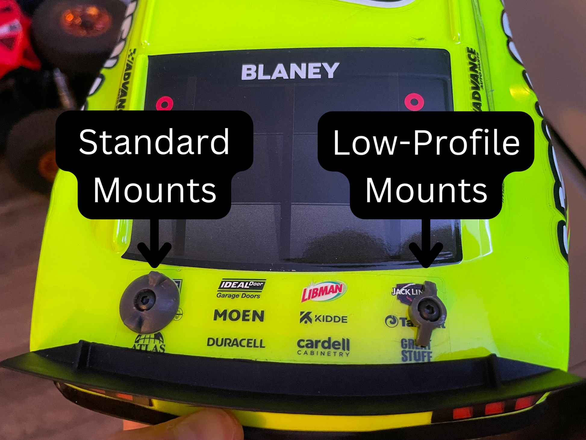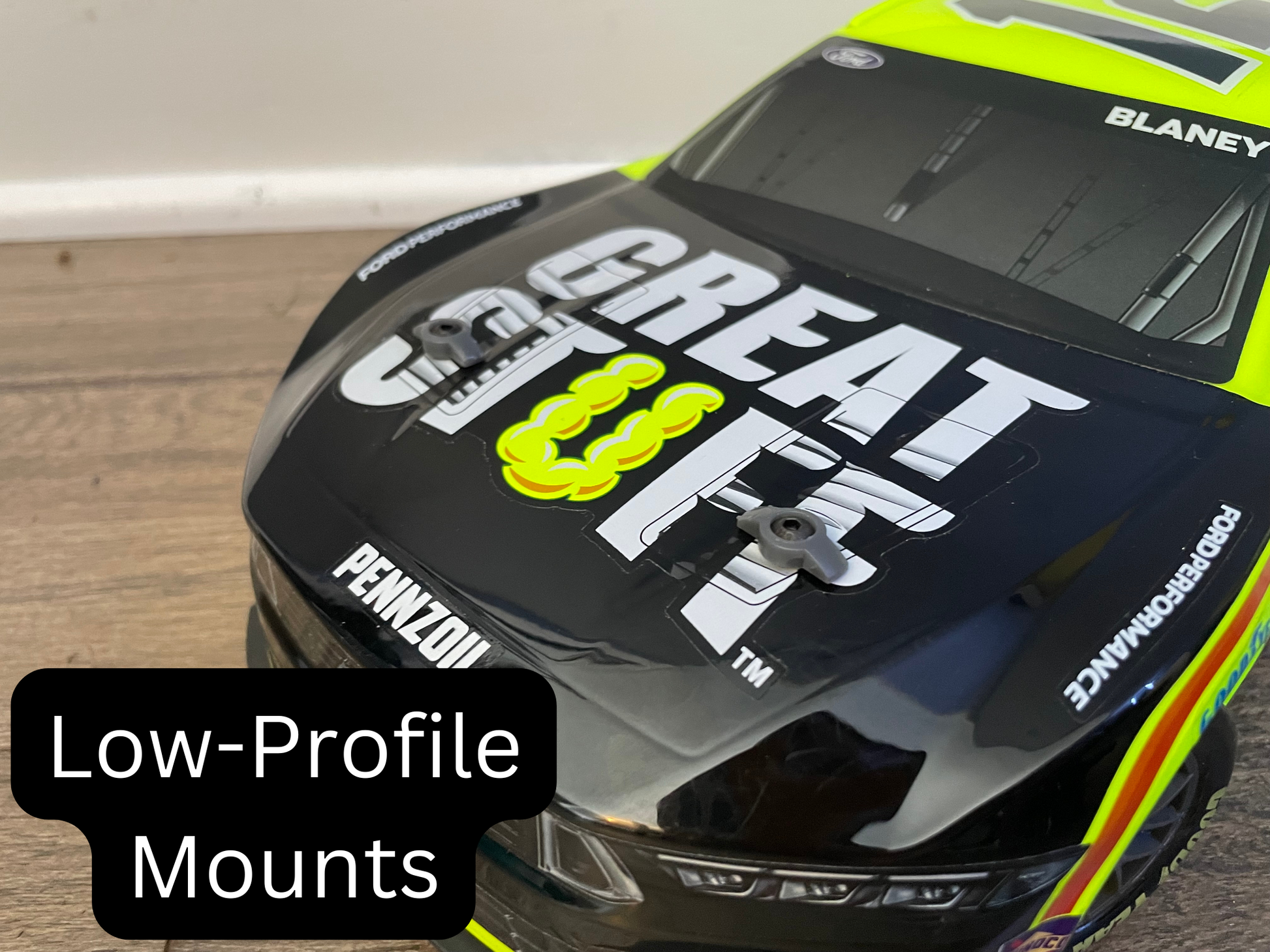 *New Options (Standard or Low-Profile Mounts) - Please see the photos to see the differences between the two options. Introducing a quick and easy clipless body mounting solution for your LOSI NASCAR! Simply twist the top knob 90 degrees counter-clockwise to unlock or 90 degrees clockwise to lock! Extremely simple to install and extremely durable due to being printed in Formlabs Durable resin and Formlabs Tough 2000 resin. This solution means you'll never lose a body clip ever again since these parts are always bolted to the car. Never forget to bring them with you and whenever you need to access the underside you can do so in seconds without any pain! These parts are designed to last an extremely long time and as always just reach out if you have any questions or needs!